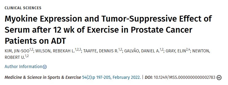 [2] KIM, JIN-SOO; WILSON, REBEKAH L.et al. Myokine Expression and Tumor-Suppressive Effect of Serum after 12 wk of Exercise in Prostate Cancer Patients on ADT. Medicine & Science in Sports & Exercise 54(2):p 197-205, February 2022.DOI: 10.1249/MSS.0000000000002783