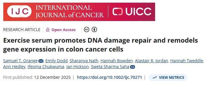 [1] Orange ST, Dodd E, Nath S, et al. Exercise serum promotes DNA damage repair and remodels gene expression in colon cancer cells. Int J Cancer. 2026;158(10):2641-2649. doi:10.1002/ijc.70271